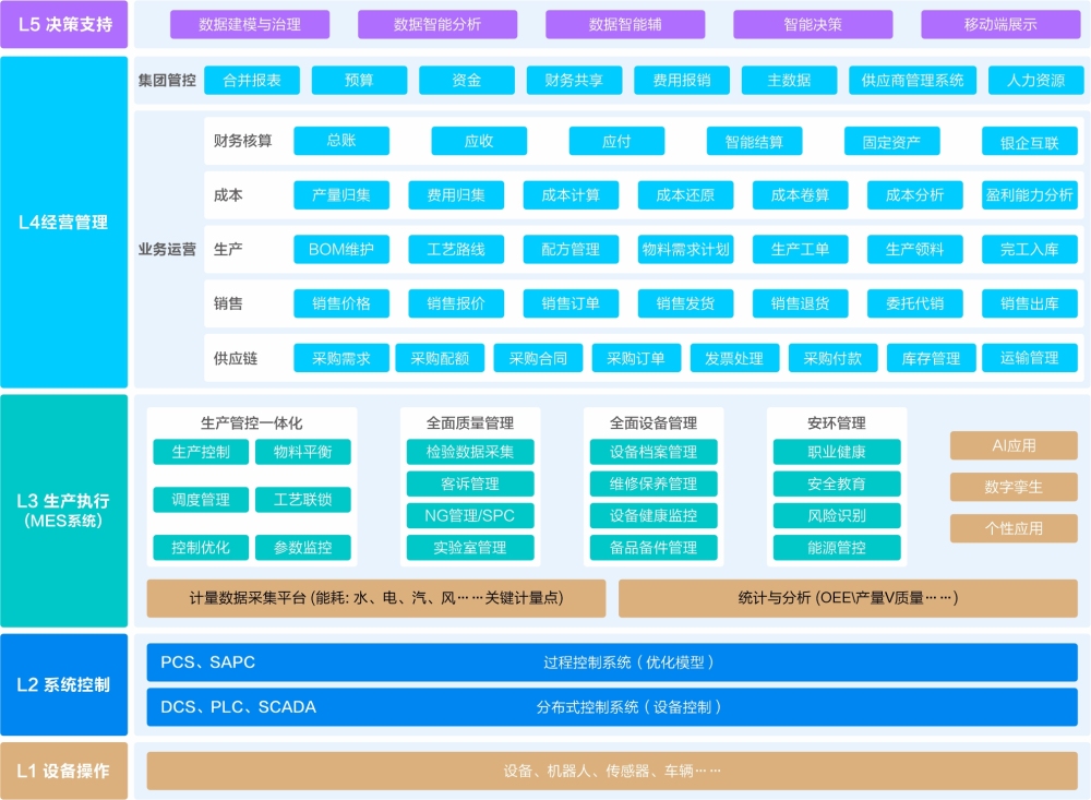 通过位于L4层级的ERP作为企业经营管理平台,聚焦于企业人财物产供销各类业务的执行与管控,以及业财一体化。位于L3层级的MES则关注日生产计划的执行、车间设备资源、执行过程的数字信息采集等,并为质量在生产环节的追溯提供数据。二者的对接主要为企业高阶生产计划与车间执行任务的对接,同时MES系统为ERP提供能耗、质检、设备管理等数据